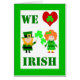We Heart / Love Irish, St. Patrick's Day paper greeting card. St. Patrick's Day card from both of us / couple. Cute characters holding shamrocks are dressed up as a leprechaun and an Irish girl with orange hair and polka dotted dress. A red heart with a shamrock inside of it is at the top of the card. Various shades of green used for an Irish happy look. Characters courtesy:Clker. Art, image, and verse copyright © Shoaff Ballanger Studios.