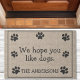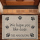This funny pet dog doormat design features the words "We hope you like dogs". Personalise this cute rustic faux burlap country door mat with your family name and custom greeting. The perfect unique modern housewarming or new homeowners gift.