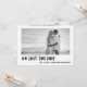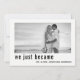 This simple yet elegant simple minimalist modern just married wedding announcement and reception card features your own photo with a black and white Zazzle filter applied, along with the sentiment "We just became Mr. and Mrs." on the front of the card with hand lettered script typography, as well as your married names. Back of the invitations features the same photo with a transparent overlay and a black and white filter, and your wedding reception information on the back. Easy to customise with your own photo and text.