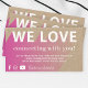 Customise this trendy business marketing card. This is perfect for an e-commerce business such as a boutique, Etsy store, or any other small business. It features the phrase "WE LOVE" and has customisable text to explain further details . The reverse side can be used to display your personalised company logo. This product expresses interest in connecting with customers by encouraging shoppers to message you and to follow your business on social media with the information provided next to the Facebook, Instagram, and YouTube social media icons.