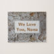 "We Love You Nana" is the sentiment on this personalised puzzle. The background features a tree bark photo which displays an abstract pattern. The light grey background of the tree's trunk is dotted and swirled with golden brown and red dots along with curved lines in dark grey. The centre of this rustic puzzle is a light grey rectangle that provides the solid background colour for "We Love You, Nana" which can easily be customised to suit your needs.