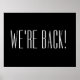 A simple yet bold white poster that states, “WE’RE BACK” to be displayed for a business, organization or group that has been temporarily closed. A great poster that can be placed in a store window to let everyone know that you’re back in business.