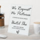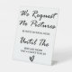 This is a black and white wedding sign that reads,"We request no pictures be posted on social media until the bride and groom have the chance to do so." This sign encourages guests to hold off on posting photos online until the bride and groom have the chance to post theirs first.