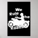 This wall art is for the biker or biker at heart. A graphic of a biker riding a motorcycle is accompanied by the words, "We rule the roads." Buy as is or customise to change the poster colour.
