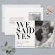 This chic black and white wedding announcement is a great way to let your friends and family know that you have eloped, had a secret ceremony, or private wedding! The front of the card is designed to showcase your favourite vertical orientation photo, with the words 'We Said Yes' at the left in a black, timeless and elegant fashion magazine typography. Your names, wedding date and location appear at the bottom left in a modern, fashion sans serif font. The back of the card allows you to type in a personal greeting, and also features a black and white framed vertical/portrait orientation photo. This is a template design, and is very easy to customise to suit your needs. Photos and design copyright Anastasia Surridge, 2017.