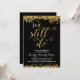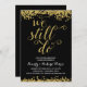 A golden 50th wedding anniversary party invite that features the romantic phrase "We still do" written in beautiful calligraphy script with a faux gold foil look, faux gold confetti on the top and bottom of the card, and a chic black background.