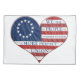 Colourful red, white and blue original 13 state Betsy Ross American flag in the shape of a heart, with the first line from the Preamble of the United States of America Constitution.