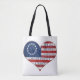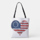 Colourful red, white and blue original 13 state Betsy Ross American flag in the shape of a heart, with the first line from the Preamble of the United States of America Constitution.
