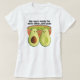 Fun avocado tee. Avocado halves fondly looking at each other in front of bowl of guacamole under the words,