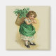 Vintage design features a young Irish girl with a basket of Shamrocks on her back. This wee Colleen is dressed in green with shamrock patterned petticoat showing. Design has been hand retouched. Front text says... The Wearing of the Green