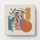 This simple and elegant boho influenced design is weathered and distressed shapes with two plan t stalks in earthy shades of orange, brown, green, and blue.