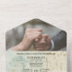 Introducing our elegant and chic wedding invitation in a sophisticated vintage style cream and mist green weathered texture and hints of floral accents in the background and dark brown lettering. At the top of the invitation you can customise with a personalised photo that will have a vintage transparent overlay so it blends seamlessly with the vintage background of this invitation. This trendy and minimalist design is perfect for couples seeking a unique vintage and elegant look for their special day. The highlight of this invitation is the convenient QR code, allowing guests to RSVP effortlessly using their smartphones. For traditionalists, we've included a traditional paper RSVP option as well. With the all-in-one design, guests can easily tear away the RSVP section and send it back. Additionally, we've provided email information for RSVPs, ensuring a seamless and convenient RSVP process. Fully customisable, this invitation also offers the option to add a cherished photo, adding a personal touch to your wedding announcement. Create a memorable and stylish impression with our customisable wedding invitation featuring a weathered background with floral accents in a cream and mist greencolor scheme, complemented by the rich texture of dark brown lettering.