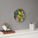 Wall clock with funny image of a yellow weaver bird building a nest.