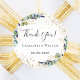 A stylish white background. Decorated with green watercolored eucalyptus leaves, sprigs, greenery, faux gold leaves faux gold glitter dust. Personalise and add your names and a date. With the text: Thank You!
