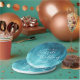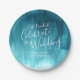Teal aqua green blue modern abstract art painted wedding paper plates. Typographical text reads Eat, drink & celebrate the wedding of then add your own names underneath. A great personalized addition to your wedding buffet or party tables. Other matching items and colors available in this design. © Original watercolor art and design by Sarah Trett www.sarahtrett.com for www.mylittleedenweddings.com