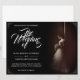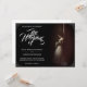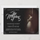 Wedding announcement with the image of a dreamy bride leaning against a wall with a bouquet of white flowers in the penumbra - classic style.