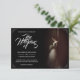 Wedding announcement with the image of a dreamy bride leaning against a wall with a bouquet of white flowers in the penumbra - classic style.