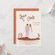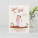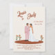 Antique elegant wedding invitation on beige background featuring a graceful bride and groom surrounded by vibrant orange flowers, evoking warmth and romance.