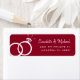 A set of custom Burgundy Wine address labels featuring fancy sketch style writing and a set of white wedding bands.