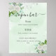 A watercolored green background, decorated with white florals, eucalyptus greenery, and faux silver glitter dust. Personalise and add your bar menu.