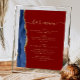 An elegant sign for your wedding bar menu. The words "bar menu" appears in gold-coloured handwriting calligraphy with swashes at the beginning and end, with customisable text below. A navy blue watercolor agate design trimmed with gold faux glitter decorates the left border on a burgundy red background. See our collection for matching wedding invitation suite and day-of stationery.