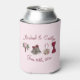Can cooler design features an original illustration of a wedding boutonniere, bells, bouquet and bow tie on a pink background.