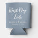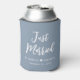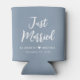 Dusty blue can cooler party favour for your wedding with "Best Day Ever" and "Just Married" in a stylish white script, your first names and the date.