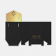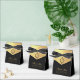 An elegant black and gold wedding favor box. The flap is faux gold foil and it has a black crest with the wedding monogram in it, from the two initials of the bride and groom.