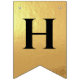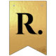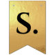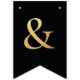 A bunting flags banner for a wedding with black and gold wedding colours, with the words "Mr. & Mrs." and the family name of the new couple and 3 hearts. The text is in black caps on faux gold foil background, the hearts and the ampersand are faux gold foil on black background.