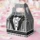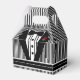 The perfect little tuxedo favour box! Black formal tuxedo with black bow tie. White button down shirt. Black and white striped background. French stripes on the handle. The back has room for your personalised custom message!. Perfect for formal events, black tie fundraisers and weddings. To see matching products-Please visit my store "The Hungarican Princess" at www.zazzle.com/hungaricanprincess*. Look in my "Black Tie Event" department category to see the "Formal Black Tie Tuxedo Collection".