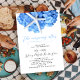 Wedding invitations to the wedding breakfast. Blue flowers and white starfish design from the Seaside Garden design line. The image is at the top of white paper. The first line, in blue script, is, "The morning after" with a line swash underneath the wording. The next line is, "Breakfast with the newlyweds" and their names, along with "Mr. and Mrs." comes next. The last template holds all party information with date, time, and location. Also include a RSVP if needed. The paper is a bit smaller than standard 5x7, to include with select invitations. Or, change the size easily.