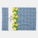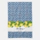 Wedding Bridal Shower Anniversary Gift personalised name tea kitchen towel. Mediterranean Amalfi coast blue tiles pattern and lemons, blue and yellow combination. Makes a lovely wedding gift, bridal shower gift, anniversary gift or any occasion special gift.