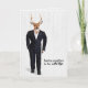 Big buck deer in wedding tuxedo on whitewashed wood background for groomsman request.
