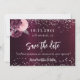 A modern and elegant Save the Date for a wedding. A deep burgundy gradient background decorated with flowers and faux silver confetti. Personalise and add a date and names. The text: Save the Date is written with a large trendy hand lettered style script.