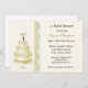 A bridal shower invitation with pretty gold wedding cake with bride and groom topper with umbrella on buff background. Side border of daisies and bows.