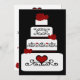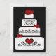 A classy and modern wedding cake in white with black ornaments, red highlights, and red roses.