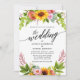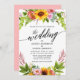 Modern Calligraphy Script, Watercolor Sunflower Boho Floral with Roses, Peonies and Greenery Wedding Invitation. Pink Back.