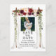 Elegant Wedding Canopy Watercolor Burgundy Marsala Floral Wedding Engagement Announcement Save The Date Postcard includes beautiful burgundy roses, pink roses, and red roses. The wood wedding canopy arch includes botanical greenery. Couple Photo.