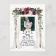 Elegant Wedding Canopy Watercolor Burgundy Marsala Floral Wedding Engagement Announcement Save The Date Postcard includes beautiful burgundy roses, pink roses, red flowers and blue flowers. The wood wedding canopy arch includes botanical greenery. Couple Photo.