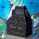 A dark navy blue favour box with gold stars for a navy and gold celestial wedding theme. On both sides, it has the message Thank You and the names in elegant calligraphy in it (and the date in smaller digits under the names). All text is golden and can be changed.