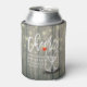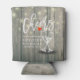 Wedding Shower Can Cooler / koozies Templates - Elegant Lettering Script, Vintage Champagne Glasses and String Lights on Rustic Wood Background.