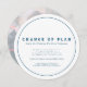 Change of plan simple text classic dark blue and white card with a photo on reverse. Let your guests know that your wedding or other event has been cancelled or postponed due to unforeseen circumstances.