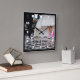 A cute picture of a bride and grooms legs and feet. Wearing their fancy wedding dress, with casual running shoes. He has black sneakers and hers are vibrant bubblegum pink! The contrast of the black and white theme with the pink shoes really makes the image pop! The happy couple is standing in a diner with black and white chequered floors. A retro fifties diner style theme. Personalise with your names and wedding date.