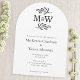Simple wedding couple monogram initials with botanical line art leaf details for a beautiful and unique modern minimalist black and white wedding invitation. Change any of the text to personalise.