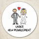 A cute cartoon of a newlywed couple captioned 'under new management'. Is it the bride or groom that wears the trousers in the marriage? Great for a wedding gift, or to wear on honeymoon.