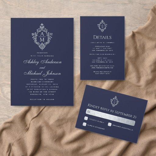 Navy Blue Faux Silver Crest Monogram Wedding SuiteDesigned by Artifex Designs