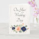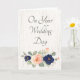This wedding congratulations card for the happy couple has a simple pale white woodgrain background for a rustic look with a pretty floral accent of peonies and roses in navy blue and blush pink or soft peach for an elegant touch. Simple but elegant lettering spells out your own custom message on the front and inside of this greeting card.