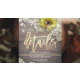 Vintage Lace, Sunflower and String Lights on Rustic Wood Background.