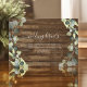 Eucalyptus Greenery Succulent Botanical Watercolor Spring Wedding Details Card on Rustic Outdoor Wood background - includes beautiful and elegant script typography with modern botanical leaves and greenery for the special Wedding day celebration.
