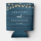 Wedding Dinner and Party, Rustic String Lights, dark teal blue green wood background Can Cooler
